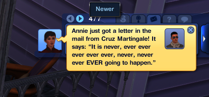 Despite woohooing and being romantic, Cruz is still just a very good friend of Beatrice's and not a love interest for some reason. Cruz seems to like Beatrice, but is not at all interested in Annie. (I wonder if I accidentally had Annie write him a love letter when I meant to have Beatrice do it.)